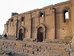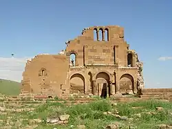 The building, with three aisles, structured with thick lateral walls, is one of the biggest Armenian churches of the period.[11] With arcades on the north, west and south sides, two little chapels near the apse and two absidal niches at the end of the lateral arcades, the basilica in origin could be covered wooden trusses. The north-east chapel keeps the most part of two superimposed vaults which the superior is inclined (taller near the nave).[12]