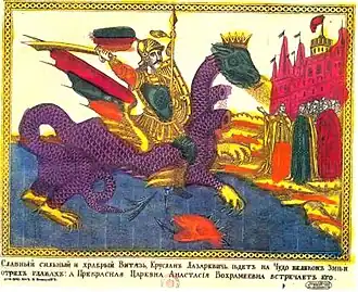 Yeruslan Lazarevich (Russian: Еруслан Лазаревич), also known as Eruslan Lazarevich or, in the Tatar original, Uruslan, is the Russian folk-literature hero of The Tale of Eruslane Lazarevic, which recounts the many military and amorous adventures of a young and beautiful hero. Old Russian readers greatly enjoyed the tale; due to the variety of its content and by appearing frequently in lubok illustrated prints, it spread widely among the people. Its influence is noticeable even on some retelling of tales about Ilya of Murom.