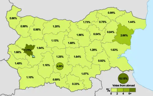 At the 2017 elections, Yes, Bulgaria won a total of 101,217 votes, or 2.96% of all votes cast, leaving it as the 7th largest formation, but without parliamentary representation.[25] In Sofia's three constituencies, the party gained a total of 7.77% of all votes cast, coming in at 4th place, less than 1,000 votes behind 3rd placed United Patriots. In total, more than 70,000 votes (almost 70%) came from Sofia, Plovdiv, and Varna, as well as from Bulgarians abroad.[25]