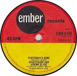 "Yesterday's Gone" was the British duo's only UK hit.[3] Released 27 September 1963, "Yesterday's Gone" entered the UK top 50 on the chart dated 30 November 1963 and remained on the chart for seven weeks and peaked at No. 37. The follow-up single "Like I Love You Today" was released in January 1964 with no evident reaction. Chad Stuart would recall: "There was just no way a little independent label could compete in those days...John Barry bought himself out of his contract and we were stuck. I think we would've broken up then and there except for the fact that Noel Rogers, who published 'Yesterday's Gone' fenced it off to this other company in America called World Artists".[4] Stuart is referring to the Pittsburgh-based World Artists Records which released "Yesterday's Gone" in the US in March 1964 after label president Lou Guarino heard the single while visiting Great Britain in search of local tracks which World Artists might profitably release, the "British Invasion" of the US music scene then being in full swing.[5]