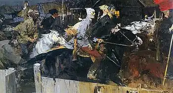 Since 1936 Moiseenko lived in Leningrad. He was trained at the Academy of Arts under Alexander Osmerkin and taught at the Academy from 1947, becoming a professor in 1957.[1] Moiseyenko developed the theme of romantic heroism, which can be seen his paintings such as The Reds Came, 1961; Comrades, 1964; Cherry, 1969; all of which are exhibited in the State Russian Museum in Saint Petersburg.[2]
