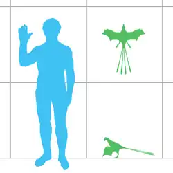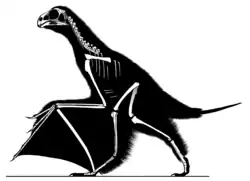 Like other scansoriopterygids, the head was short and blunt-snouted, with a downturned lower jaw. Its few teeth were present only in the tips of the jaws, with the four upper front teeth per side being the largest and slightly forward-pointing, and the front lower teeth being angled even more strongly forward.[1] The long, slender forelimbs were similar, overall, to those of most other paravian dinosaurs. Like other scansoriopterygid dinosaurs, the first finger was shortest and the third was the longest. Unlike all other known dinosaurs, a long, pointed wrist bone known as a "styliform element", exceeding both the third finger and the ulna in length, extended backward from the forelimb bones. This styliform, an adaptation to help support the membrane, may have been a newly evolved wrist bone, or a calcified rod of cartilage. It was slightly curved and tapered at its outer end.[1]