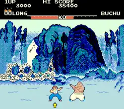 The player faces a variety of opponents, each with a unique appearance and fighting style.[11][12] The player can perform up to 16 different moves,[13] using a combination of buttons and joystick movements while standing, crouching or jumping.[14] Moves are thrown at high, middle, and low levels. Regardless of the move that defeated them, male characters (save Feedle) always fall unconscious lying on their backs with their legs apart (Oolong flails his legs), and female characters always fall lying on their sides. Feedle disappears. When a player gains an extra life, the word "xiè xiè" (Mandarin for "thank you") is heard.