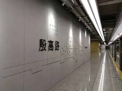 Yingao Road (Chinese: 殷高路; pinyin: Yīngāo Lù) is a metro station on Line 18 of the Shanghai Metro. Located at the intersection of Yingao Road and North Guoquan Road along the boundary of Baoshan District with Yangpu District in the city of Shanghai, the station was opened with the rest of phase one of Line 18 on December 30, 2021.[1][2][3] During the planning stage of Line 18, the station was known as North Guoquan Road (simplified Chinese: 国权北路; traditional Chinese: 國權北路; pinyin: Guóquán Běilù).[4]