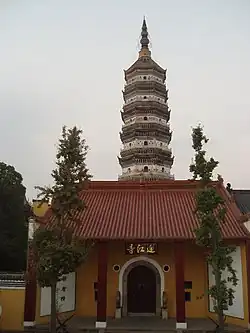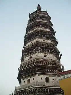 The Zhenfeng Pagoda (振风塔) was originally built in the Song dynasty (960–1279) and reconstructed in 1570 in the reign of Longqing Emperor (1567–1572) of the Ming dynasty (1368–1644). It initially called "Ten Thousand Buddha Pagoda" (万佛塔). The 64.8-metre-high (213 ft) pagoda has the brick-and-wood structure with seven storeys and eight sides. Curved bars and cornices are set on each story, which are magnificent and become the symbol of Yingjiang Temple. Over 1,200 statues of Buddha are enshrined in its interior.[2][1]