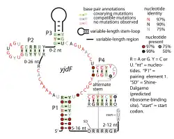The yjdF RNA motif is a conserved RNA structure identified using bioinformatics.[1] Most yjdF RNAs are located in bacteria classified within the phylum Bacillota. A yjdF RNA is found in the presumed 5' untranslated region (5' UTR) of the yjdF gene in Bacillus subtilis, and almost all yjdF RNAs are found in the 5' UTRs of homologs of this gene. The function of the yjdF gene is unknown, but the protein that it is predicted to encode is classified by the Pfam Database as DUF2992.[2]