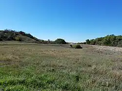 Hays City and Ellis were founded in 1867 and 1870, respectively. However, as fertile as the valley was, the Hog Back ridge of limestone and chalk between the two settlements was considered unsuitable for wheat farming and was initially rejected by immigrant settlers.[49] By 1910, the local press referred to the hill as the "long neglected" Hog Back.[50] Much of these hilltops remain largely in pasture.[51]