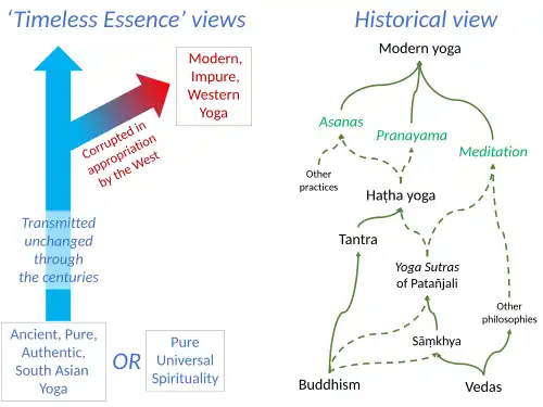 The scholar of religion Neil Dalal writes that a mainstream view of cultural appropriation assumes that modern yoga has its roots in South Asia, and that there exists some ancient, pure, and authentic South Asian yoga which is at risk of being corrupted in the modern world.[15] An alternative spiritual but not religious view, held by some practitioners of modern yoga, is that it embodies a pure and universal spirituality, which cannot be corrupted.[15] Dalal states that both views consider yoga to have a "timeless ahistorical essence".[15] Yoga scholarship, investigating the history of yoga, holds instead that yoga does not have an essence as it changed continually over the centuries, and that talk of purity or authenticity does not make sense; indeed, talk of cultural appropriation may not make sense in the case of yoga either.[15][16] Further, yoga in India has declined in its traditional form, and has taken on aspects of its modern western form, complicating the discussion and implying that many people in India have accepted a more western view of yoga.[17][18]