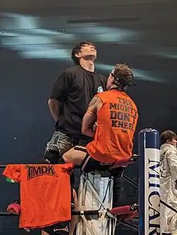 On October 9, 2017, at King of Pro-Wrestling, Komatsu and Tanaka, billed as "Yoh" and "Sho", returned to NJPW, when they were revealed as Rocky Romero's new tag team Roppongi 3K. The two defeated Funky Future (Ricochet and Ryusuke Taguchi) in their return match to become the new IWGP Junior Heavyweight Tag Team Champions.[34] Through their affiliation with Romero, Yoh and Sho also became part of the Chaos stable.[35] On November 5 at Power Struggle, Roppongi 3K defeated Super 69 (ACH and Ryusuke Taguchi) in the finals to win the 2017 Super Jr. Tag Tournament.[36] On January 4, 2018, Roppongi 3K lost the Junior Heavyweight Tag Team Championship to The Young Bucks (Matt Jackson and Nick Jackson) at Wrestle Kingdom 12,[37] but won it back on January 28 at the New Beginning in Sapporo. In May 2018, Yoh entered his second Best of the Super Juniors tournament. He finished the tournament with 3 wins and 4 losses, failing to advance to the finals. In October, Sho and Yoh entered the 2018 Super Junior Tag League, winning the tournament for the second time in a row to face El Desperado and Yoshinobu Kanemaru at Wrestle Kingdom 13. However, an earlier loss to the team of Shingo Takagi and Bushi made the title match a triple threat, that Takagi and Bushi would go onto win, with Takagi pinning Sho. At New Japan’s 47th Anniversary Event, Sho and Yoh would defeat Takagi and Bushi to win the championship for a third time. In June, Roppongi 3K would lose the Junior Tag Team Championship to the team of El Phantasmo and Taiji Ishimori. In November, Sho and Yoh would win the Super Junior Tag League for the third time in a row. At Wrestle Kingdom 14, Roppongi 3K would defeat Phantasmo and Ishimori to win the titles for the fourth time. Roppongi 3K would make their first successful title defense against Desperado and Kanemaru at The New Beginning in Osaka. They would make their second successful title defense against Rocky Romero and Ryusuke Taguchi on the first night of the New Japan Road tour. Following New Japan’s return to producing wrestling shows, Yoh entered the 2020 New Japan Cup losing to Bushi in the first round.[38] During this match, Yoh tore his left ACL which kept him out of action for the rest of 2020.[39][40]