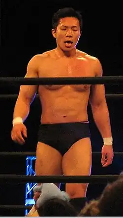 He made his debut for NJPW on November 19, 2012, on NJPW's NEVER project's Shodai NEVER Musabetsu Kyu Oza Kettei Tournament show where he lost to Takaaki Watanabe.[7] Komatsu competed as one of NJPW's "Young Lions", a class of rookie wrestlers who work mostly against each other early on, wearing all black gear and with no particular ring character, all part of the structured learning process in NJPW.[6] In 2013, he competed in his first major NJPW tournament, teaming up with Kushida to compete in the 2013 Super Junior Tag Tournament. The team lost in the first round to Bushi and Valiente.[8] [9] On January 4, 2014 Komatsu teamed up with Jyushin Thunder Liger, Manabu Nakanishi and Super Strong Machine to work a non-televised match at Wrestle Kingdom 8, NJPW's biggest show of the year. The team lost to Bushi, Captain New Japan, Hiroyoshi Tenzan and Tomoaki Honma.[10][11] Throughout 2013 and 2014, Komatsu often faced off against fellow Young Lion Sho Tanaka, with both men trading victories in both singles and tag team competition.[12] By 2015, Komatsu and Tanaka had begun teaming together on a regular basis, including working together in the New Japan Rumble as part of Wrestle Kingdom 9 on January 5, 2015. The two teamed up to eliminate Tiger Mask and Taichi but were both eliminated by Tama Tonga.[13] On January 15, 2015, Komatsu competed at the Fantastica Mania 2015 event as he was called upon to replace the injured Rey Cometa in the NJPW/Consejo Mundial de Lucha Libre (CMLL) co-promoted event. The team of Komatsu and Kushida lost to Bárbaro Cavernario and Yoshi-Hashi.[14] On February 11 at The New Beginning in Osaka, Komatsu lost to Tanaka and three days later Komatsu and Satoshi Kojima lost to Captain New Japan and Nakanishi.[15][16] The Invasion Attack 2015 show saw Komatsu, Alex Shelley, Captain New Japan, Kushida and Yuji Nagata defeated Liger, Nakanishi, Ryusuke Taguchi, Sho Tanaka and Tiger Mask.[17]