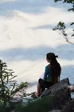 The Yoho River originates at the north end of Yoho National Park and flows generally south to join the Kicking Horse River some distance northeast of Field. It begins at the toe of the Yoho Glacier[3] and flows within 5.8 kilometres (3.6 mi) from its source it has already received the waters of Waves Creek, Twin Falls Creek, Fairy Creek & the Little Yoho River. It continues south for another 4.4 kilometres (2.7 mi) to its confluence with the stream Takakkaw Falls is on. Along that stretch is a significant canyon in which the river drops over at least one major waterfall. The river also picks up the waters of Whiskey-Jack Creek near Takakkaw Falls. From there it flows another 7.8 kilometres (4.8 mi) to its confluence with the Kicking Horse River. At the confluence, the Yoho is actually the bigger of the two rivers. It is also the siltier of the two at the time, and most of the silt the Kicking Horse has comes from the Yoho.