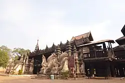 Yokesone Monastery (Burmese: စလေ ရုပ်စုံကျောင်း) is a historic Buddhist monastery in Sale, Magwe Region, Myanmar. The wooden monastery, which dates to 1882, is known for its abundance of woodcarvings which depict scenes of the Jataka tales.[1] The monastery was constructed with 153 teak posts, each more than 3 feet in diameter, which hold the building up about 10 feet above the ground, during the time of King Thibaw. It housed monks from its construction until it was transformed into a museum in 1996.[2] Aside from the carvings, guests can also view an ancient Buddha image and utensils of Yadanabon 19th century period.[3] Additionally, the museum houses a plethora of unidentified sculptures, a large throne once used by leading monks, as well as an old wooden box that served as carriage for clergy members. Behind the monastery in a small building, work from the famous Burmese playwright and poet, as well as favorite bard in King Mindon's court, U Ponnya, also hailing from the area, are on display.
