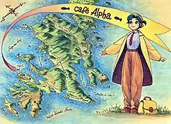 Alpha Hatsuseno is an android ("robot person") who runs an out-of-the-way coffee shop, Café Alpha, on the lonely coast of the Miura Peninsula of Japan, while her human "owner" is on a trip of indefinite length.[7] Though she spends much of her time alone, Alpha is cheerful, gregarious, and—unlike the slowly declining humans—immortal.[6]