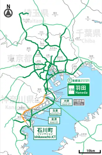 | Tokyo | Ōta | 0.0 | 0.0 | 150 | Haneda | Northern terminus, expressway continues north as the Haneda Route | |