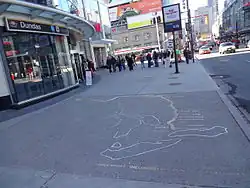 Although current tourist campaigns do not make much of Yonge Street's length, its status as an urban myth was bolstered by an art installation at the foot of Yonge Street and a map of its purported length laid out into the sidewalk in bronze at the southwest corner of Yonge and Dundas Streets.[34] However, possibly due to wider recognition of the street's actual length, the map inlay has now been removed.