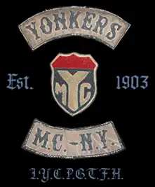 The Yonkers Motorcycle Club originally started as The Yonkers Bicycle Club and was founded on November 19, 1879.[1] The Yonkers Motorcycle Club was formed in 1903 in Yonkers, New York by President George "Usco " Ellis (later appointed State Commissioner for New York of the Federation of American Motorcyclists in August 1915). The Yonkers Motorcycle Club served as a civil defense messenger service during the earlier part of the 1900s delivering messages to various government officials throughout the country. An article taken from the Boston Daily Globe March 11, 1921, titled Cyclists Return After Call on Vice President, describes the journey that George A. Ellis and Henry E Andrews made when they left Boston on a Sunday morning at 9 o'clock am, bearing a message from Gov.Cox to Vice President Coolidge. They completed their first leg of the journey, a distance of 510 miles, in 22 hours and 45 minutes, arriving in Washington Monday morning. They left Washington at 8' o'clock Tuesday morning, and stopped at Ellis' home, Yonkers, en route to Boston.[3] Since 1924, the club has been chartered by the American Motorcyclist Association.[2] The Yonkers Motorcycle Club is the oldest active motorcycle club in the world.