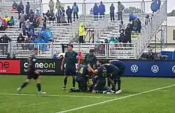 The team has been called "Y9" and "The Nine Stripes" by the media and the league.[15][16][17] York9's first match was the inaugural CPL match at Forge FC on April 27, 2019,[18] launching the 905 Derby with a 1–1 draw, as Ryan Telfer scored the first goal in Canadian Premier League history.[19]