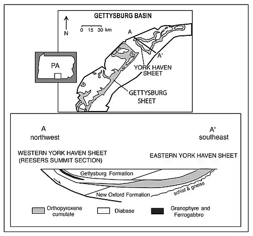 - ^ a b c d MANGAN, MARGARET T.; MARSH, BRUCE D.; FROELICH, ALBERT J.; GOTTFRIED, DAVID (1993-12-01). "Emplacement and Differentiation of the York Haven Diabase Sheet, Pennsylvania". Journal of Petrology. 34 (6): 1271–1302. doi:10.1093/petrology/34.6.1271. ISSN 0022-3530.