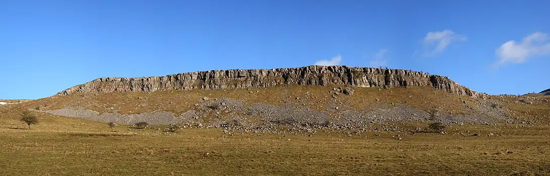 The dales are U- and V-shaped valleys, the former enlarged and shaped by glaciers, mainly in the most recent Devensian ice age.[41] The underlying rock is mainly Carboniferous Limestone, which results in a large areas of karst topography,[14] in places overlain with shale and sandstone and topped with Millstone Grit,[42] although to the north and west of the Dent Fault[43] the hills are formed from older Silurian and Ordovician rocks.[44][45]