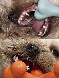 Low blood sugar in puppies, or transient juvenile hypoglycaemia, is caused by fasting (too much time between meals).[55] In rare cases, hypoglycaemia may continue to be a problem in mature, usually very small, Yorkies. It is often seen in Yorkie puppies at 5 to 16 weeks of age.[55] Very tiny Yorkie puppies are especially predisposed to hypoglycaemia because a lack of muscle mass makes it difficult to store glucose and regulate blood sugar.[55] Factors such as stress, fatigue, a cold environment, poor nutrition, and a change in diet or feeding schedule may bring on hypoglycaemia.[56] Low blood sugar can also be the result of a bacterial infection, parasite or portosystemic liver shunt.[57] Hypoglycaemia causes the puppy to become drowsy, listless (glassy-eyed), shaky, uncpoglycaemic attack, the puppy usually has very pale or grey gums.[58] The puppy also may not eat unless force-fed.[55] Hypoglycaemia and dehydration seem to go hand-in-hand, and force-feeding or injecting fluids may also be necessary. Additionally, a hypoglycaemic Yorkie may have a lower than normal body temperature and, in extreme cases, may have a seizure or go into a coma.[59] A dog showing symptoms should be given sugar in the form of corn syrup or Nutri-Cal and be treated by a veterinarian immediately, as prolonged or recurring attacks of hypoglycaemia can permanently damage the dog's brain.[59] In severe cases, it can be fatal.[55]