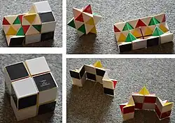 The Yoshimoto Cube is a polyhedral mechanical puzzle toy invented[1] in 1971 by Naoki Yoshimoto (吉本直貴, Yoshimoto Naoki), who discovered that two stellated rhombic dodecahedra could be pieced together into a cube when he was finding different ways he could split a cube equally in half. Yoshimoto first introduced his cube in 1972 at a solo exhibition entitled "From Cube to Space", and later developed three commercial versions. In 1982, Yoshimoto Cube No. 1 was included in the Museum of Modern Art's permanent collection.[2]