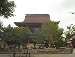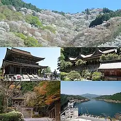 The most well-known area within the town is Yoshino Mountain, famous for its many thousands of sakura trees; much poetry has been written on the subject by several famous authors, including Chiyo and Uejima Onitsura.[6] These flowering cherry trees were planted in four groves at different altitudes, in part so that the trees would be visible coming into bloom at different times in the spring. An account of Yoshino written in about 1714 explained that, on their climb to the top, travelers would be able to enjoy the lower 1,000 cherry trees at the base, the middle 1,000 on the way, the upper 1,000 toward the top, and the 1,000 in the precincts of the inner shrine at the top.[7]