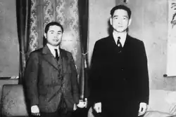 At the end of World War II, the defeat of Japan initially represented an enormous setback for Kodama. Shortly after the announcement of the unconditional surrender of Japan on August 15, 1945, he witnessed the ritual suicide of Admiral Ōnishi, but was subsequently unable to bring himself to commit seppuku.[12] A little later he acted as an advisor to the Japanese interim government of Prince Naruhiko Higashikuni.[13] Since Kodama feared the confiscation of his property by the US occupation authorities, he gave parts of it to the yakuza chief Karoku Tsuji.[14] Other possessions were kept on the grounds of the Imperial Palace in Tokyo.