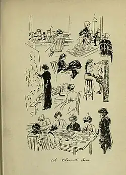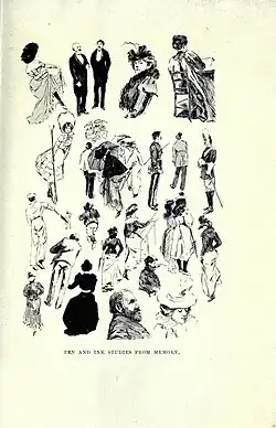 His writings were also supportive of the suffragette movement and he had many female friends. His 'Idealised John Bullesses' and biographies frequently note his interactions with, and support for, women's marches and suffragettes like Christabel Pankhurst. Sarah Grand noted he was 'a thorough gentleman' when reading his writings in 1912.[22] Another friend, Flora Roscoe; an Englishwoman who lived in the hamlet of Wedhampton; knowing how Markino had a hatred of business (something which he believed the English took too seriously) invited him in 1912 to stay to sketch the area, later travelling to Salisbury.[8] Another time in a Markino fashion he met Adeline Genée:[23]