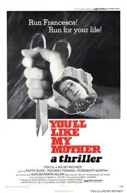 You'll Like My Mother is a 1972 American horror-thriller film directed by Lamont Johnson, from screenplay by Jo Heims based on the novel of the same name by Naomi A. Hintze. The film stars Patty Duke, Rosemary Murphy, Richard Thomas and Sian Barbara Allen.[1] The film follows a pregnant widow who travels to rural Minnesota to meet her mother-in-law, whom she discovers has sinister motives against her.[2]