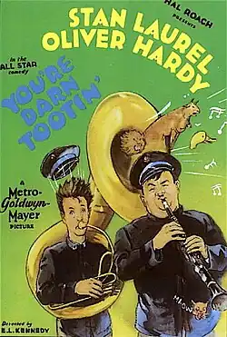 You're Darn Tootin' is a silent short subject directed by E. Livingston Kennedy starring comedy duo Laurel and Hardy. It was released on April 21, 1928, by Metro-Goldwyn-Mayer.