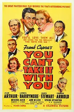 You Can't Take It with You is a 1938 American romantic comedy film directed by Frank Capra, and starring Jean Arthur, Lionel Barrymore, James Stewart, and Edward Arnold. Adapted by Robert Riskin from the Pulitzer Prize-winning 1936 play of the same name by George S. Kaufman and Moss Hart,[5] the film is about a man from a family of rich snobs who becomes engaged to a woman from a good-natured but decidedly eccentric family. A critical and commercial success, the film received two Academy Awards: Best Picture and Best Director for Frank Capra. This was Capra's third Oscar for Best Director in just five years, following It Happened One Night (1934) and Mr. Deeds Goes to Town (1936).