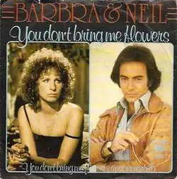 "You Don't Bring Me Flowers" is a song written by Neil Diamond with Alan and Marilyn Bergman for the daily TV sitcom All That Glitters.[1] The song was intended to be the theme song, but Norman Lear, the show's creator, changed the concept of the show and the song was no longer appropriate. Diamond then expanded the track from 45 seconds to 3:17, adding instrumental sections and an additional verse. The Bergmans contributed to the song's lyrics, which tell the story of two lovers who have drifted apart while they "go through the motions" and heartache of life together.[2]