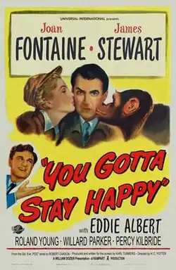 You Gotta Stay Happy is a 1948 American romantic comedy film directed by H.C. Potter and starring Joan Fontaine, James Stewart and Eddie Albert. It was distributed by Universal-International and produced by Karl Tunberg.[5] The film was written by Karl Tunberg and Robert Carson and was released on November 4, 1948. The story tells of a marital ruckus that causes pilot Marvin Payne to become enmeshed in the world of New York heiress Miss Diana Dillwood.