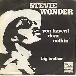 "You Haven't Done Nothin" is a 1974 funk single by Stevie Wonder, taken from his album Fulfillingness' First Finale and featuring background vocals by the Jackson 5. The politically aware song became Wonder's fourth Number-1 pop hit and his tenth Number-1 soul hit.[2] It also reached Number 1 in Canada.[3] In the UK the single spent five weeks on the chart, peaking at Number 30.[4]