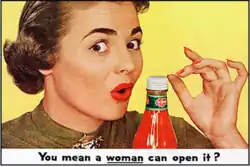 In 1953 Alcoa Aluminum[1] produced an advertisement promoting their HyTop twist-off bottle cap. The advertisement, often erroneously attributed to Del Monte Foods,[2] featured a picture of a woman with the tagline "You mean a woman can open it?"[1] The advertisement has been subject to criticism in later reviews and is viewed as a symbol of casual sexism that was prevalent in the United States during the 1950s.[3]