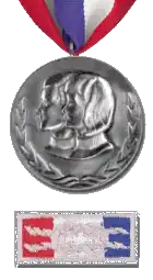 The national award consisted of a silver medallion suspended from a red, white and blue ribbon worn around the neck. The medallion bears the images of young man and a young woman above a wreath. Local recipients receive a gold version of the medallion affixed to a wooden plaque. Recipients may wear the corresponding square knot insignia, with a silver knot on a red, white and blue background, on the BSA uniform.