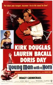 Young Man with a Horn is a 1950 American musical drama film starring Kirk Douglas, Lauren Bacall, Doris Day, Hoagy Carmichael, and Juano Hernandez.[2][3] It was based on the 1938 novel of the same name by Dorothy Baker, inspired by the life of jazz cornetist Bix Beiderbecke. The film was directed by Michael Curtiz, produced by Jerry Wald, and its screenplay written by Carl Foreman and Edmund H. North.