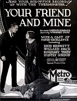 Your Friend and Mine is a 1923 American silent drama film directed by Clarence G. Badger and starring Enid Bennett, Huntley Gordon, and Willard Mack.[1] It is based upon the play of the same name by Mack.[2]