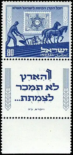 Israeli stamp commemorating the Jewish National Fund and quoting Leviticus 25:23: "The land must not be sold permanently…"