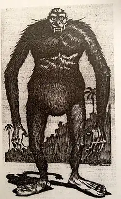 The Yowie is typically described as a bipedal, hairy, and ape-like creature, standing upright at between 2.1 m (6 ft 11 in) and 3.6 m (12 ft).[5] Reports of Yowie footprints describe them as significantly larger than a human's,[6] but alleged Yowie tracks are inconsistent in shape and toe number.[7][8] The Yowie's nose is described as wide and flat.[9][10]