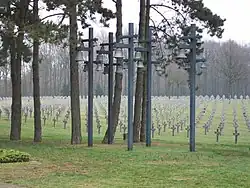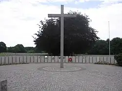 The cemetery covers approximately 28 ha (69 acres). Most burials are in individual graves marked by a grey concrete cross that includes (where known) the name, rank, and dates of birth and death. A tall cross stands in the central memorial plaza. Roads extending right and left from the plaza contain a carillon and common graves.
