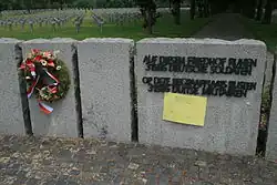 From the 1960s, protests were lodged against the German dead and the cemetery. The protests were revived in 2013, when the Dutch Anti-Fascists' League AFVN discovered that since the year 2000, the German ambassador had been holding yearly commemorations there.[2] In 2020, the AFVN started a petition[3] against the visits of the ambassador with Dutch and German Jews joining the effort,[4] along with Beate Klarsfeld and the management of the former Dachau concentration camp. A petition was launched to end the honouring and was subscribed by a.o. the board of the Dachau Museum and Concentration camp, leading Jewish figures such as the Dutch chief rabbi Binyomin Jacobs. The ambassador ended the practice.