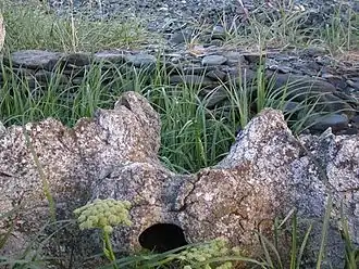 Situated on the northern shore of Yttygran island (from the Chukchi Etgyran, meaning "midway dwellings"), Whale Bone Alley consists of a large number of carefully arranged whale skulls, whale bones and stones, along with a considerable number of meat storage pits.[4] It is thought that Whale Bone Alley was used as a central shrine by a number of different villages dotted along the eastern Chukotkan coast.[5] It is thought that the site was used for initiation rituals and for sporting contests,[5] although the local Yupik have a simpler explanation that the island was simply a collective centre for the flensing, butchery and storage of whale meat, an idea supported by the etymology of the Yupik name for Yttygran: Sikliuk, from Siklyugak, meaning "meat pit" in Yupik.[4]