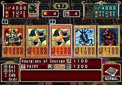 The duel ends when one player's life points are depleted, or when a player ends a turn with their deck leader completely surrounded by enemy monsters in their summoning areas.[4] Additionally, a duel can end after 99 turns, and the player with the most remaining life points is declared the winner.[5] After winning the duel, players can obtain the opponents' cards that were placed in their graveyard during the duel, using a system known as "graveyard slots"; the mechanism is similar to that of slot machines.[4] Players can also obtain cards through the "Reincarnation" system in their deck menu, which allows them to sacrifice one card in exchange for three random cards.[4]