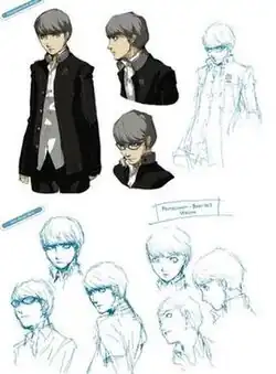Character designer Shigenori Soejima made Yu with the idea that his entire personality be decided and portrayed by the player's in-game actions and decisions. As a result, he wanted Yu to look more ambiguous than the male protagonist of Persona 3. Soejima compared Yu to the Blue Ranger from the Power Rangers franchise as such character tends to stand silent to follow the orders from his leader.[2] His character design stayed relatively similar to its initial conception, with his tone and facial expressions changing the most.[3] The feature Soejima focused on most was his eyes: he thought that having his eyes under the fringe of his hair would make him "look cool." The collar of his school uniform was made to stand a bit taller than other characters'.[3] While designing the character, Soejima noted "the main character needs to be well-rounded enough to be likeable, but also needs that extra little something to make him stand out from the rest of the cast." He made a "baby face" sketch of the character so that he and the staff could discover Yu's "special something" and discuss what would make him stand out as the protagonist.[4] In contrast to the Persona 3 protagonist who was seen as "shy" and "cute", Yu Narukami is meant to have far more different design which resulted in a smaller hair and "cool" eyes that in order to fit with the fact glasses he wears in TV World. This was primarily influenced by an unspecified Osamu Tezuka character who had a distinctive cool look while wearing glasses. Yu became the marketing core for the game as the fights in the game force the characters to wear glasses and thus Yu was drawn in order to avoid any dorky look. However, when compared with the rest of the characters, Soejima made less illustrations for the protagonist as he does not have a distinctive personality in the game due to most of his traits being made by the player.[5]