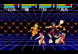 Since multiple opponents can potentially face either in front of or behind the player, pushing back on the controller's directional pad will cause a character to face the opposite direction rather than simply back away or block enemy attacks. Makyō Tōitsusen is compatible with both the Mega Drive's three-button and six-button gamepads. The three-button controller's "A", "B", and "C" face buttons can be mapped to light attack, heavy attack, and guard, while movement actions like dashing forward, dashing backward, and shifting planes are performed using basic combinations of the directional pad and face buttons. The additional "X", "Y", and "Z" inputs on the six-button controller allow for mapping these six actions to one face button each.[7][8] All characters can use combos and unique special attacks that may be performed either on the ground or in the air, some of which can be charged for larger amounts of damage.[6] Since the three-button controller is standard and pushing the back button changes a character's direction, combos are fairly simple to execute.[3][7] A few abilities require "spirit energy" that is represented by a second gauge under a fighter's health and can be refilled by holding down an attack button. A charged attack can be temporarily cancelled and stored by pushing back on the directional pad and then instantly unleashed at that strength the next time the player uses it.[7] The game offers several modes that consist of a single-player campaign for fighting consecutive one-on-one matches; an endless practice mode; and multiplayer options further divided into four-participant battle royales and tag team matches with opposing teams of two.[8] A bracketed tournament mode can also be chosen where individual players, teams of players, and the computer can battle until a final championship match. Up to four human players can participate in these multiplayer modes using Sega's Team Player multitap device.[2][7]