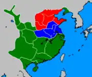 As many volunteers from different provinces had flocked to join Yuan Shao, Bohai Commandery would be far from sufficient to supply his army. Thus, Pang Ji suggested to Yuan Shao to form a secret alliance with the warlord Gongsun Zan and incite the latter to attack Han Fu's Ji Province.[11] Facing an imminent attack from Gongsun Zan, Han Fu was terrified so he listened to Yuan Shao's lobbyists, Gao Gan (Yuan Shao's nephew)[12] and Xun Chen, to give up the governorship of Ji Province to Yuan Shao in order to drive back Gongsun Zan. Yuan Shao then began to build a warlord state from Ye, the capital of Ji Province. In order to curtail Yuan Shu's sphere of influence, Yuan Shao formed an alliance with Cao Cao and Zhang Miao, and named his follower, Zhou Yu (周喁) as the Inspector of Yu Province, a title to which Sun Jian had already been entitled, and sent him to attack Sun Jian's territories in Yu Province while the latter was on his way back from Luoyang. In response, Yuan Shu allied with Gongsun Zan and Tao Qian, and ordered Sun Jian to fight his half-brother.