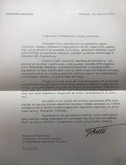 Yugoslav organizations and the Government assisted Zambia's liberation movement morally, politically and financially before the independence.[1] Yugoslav delegation headed by the Federal Executive Council's Vice-President Aleksandar Grličkov attended the formal proclamation of Zambia's independence on October 24, 1964.[1]