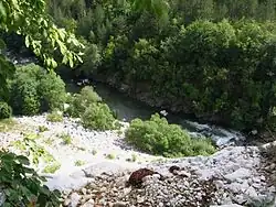 The river springs under the name Manastirska reka at an altitude of 1,840 m some 200 m north of the summit of Kurbaneri (1,864 m) in the Prespanski division of the western Rhodope Mountains. After the Haydushki Polyani resort area it flows in northern direction in a narrow deep valley, which widens only around the town of Laki, Plovdiv Province, the only settlement along its banks. The river flows into the Chepelarska reka at an altitude of 183 m at the Yugovo Inn on the second class II-86 road PlovdivSmolyanRudozem.[1] Its largest tributary is the Sushitsa (24 km).[2]