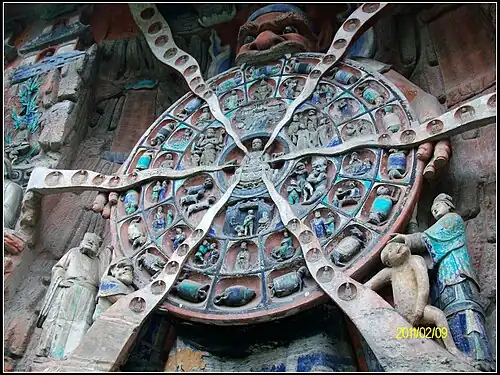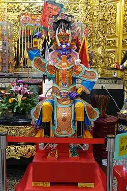 The celebrant continues to recite mantras while visualizing himself or herself as Guanyin breaking Diyu (the Buddhist hells) apart and freeing suffering beings.[28] This is accompanied by the clashing of cymbals and the ringing of vajra bells by the assisting monastics. After this, the percussion ensemble reaches a cacophony, announcing and celebrating the destruction of the hells. Led by the celebrant, the performers invite and receive bodhisattvas associated with the salvation of souls in hell, including Kṣitigarbha (Chinese: 地藏菩薩; pinyin: Dìzàng Púsà) and the "Sovereign Who Leads Souls Bodhisattva" (Chinese: 引魂王菩薩; pinyin: Yǐnhúnwáng Púsà).[13] After this, the performers chant the formal text for summoning the different types of beings to the rite. The first type to be summoned to the rite is the orphaned souls of the emperors, kings, dukes and all members of the various royal families. This is followed by the summoning of the orphaned souls of fallen warriors, officers and generals in battles and other brave soldiers who have died. Next the orphaned souls of the civil officials, ministers and other non-military officials of the past are summoned. The next group to be summoned is the orphaned souls of the scholars and members of the Confucian literati. Other groups summoned to the rite are orphaned souls of monks and nuns, virtuous lay Buddhists, Daoist practitioners, merchants and traders, soldiers who died in battles, pregnant women killed, or those who died in childbirth, courtesans, those who died due to water, fire and other accidents, and finally the beings of the six realms of saṃsāra and the ten types of orphaned souls.[24][26]